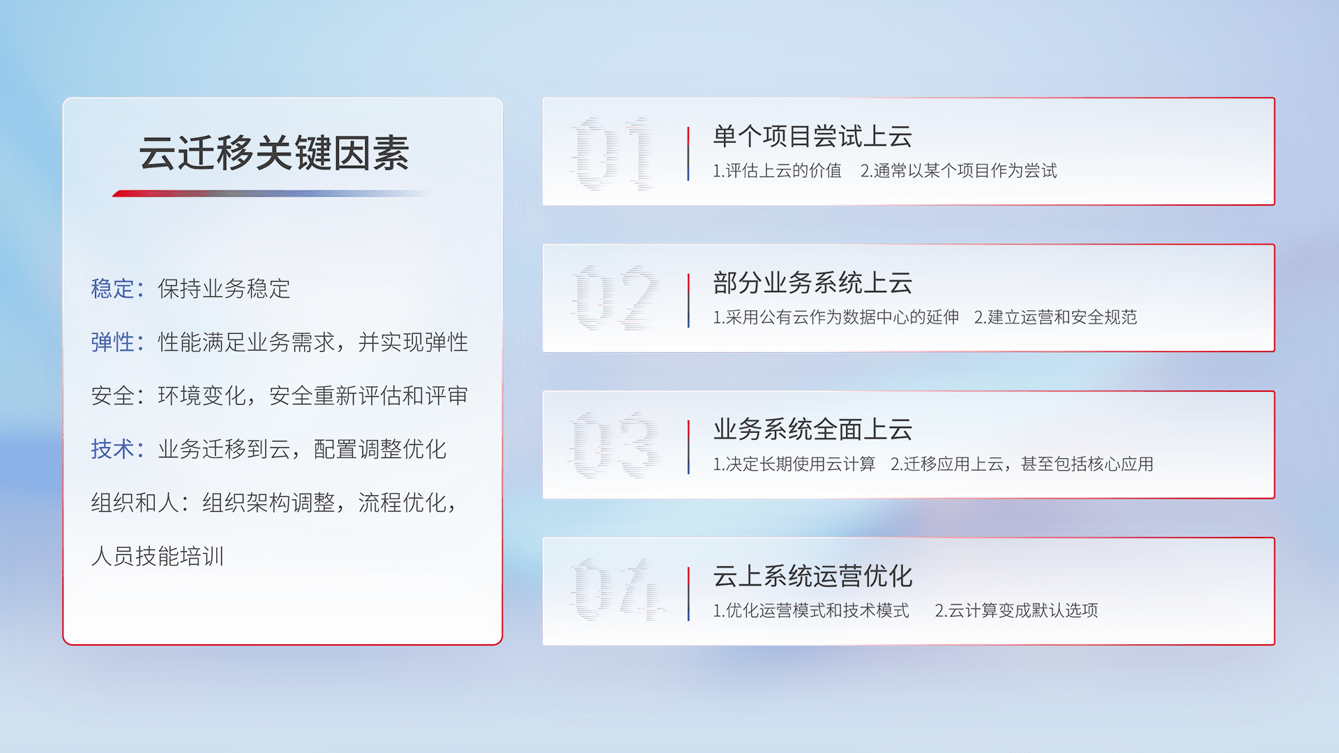结合实际业务,,,,从规划设计、、云平台选型、、、、云原生改造、、、、数据迁移、、集成交付,,,,迁移全过程为客户识别最佳上云路径,,做好风险识别管理,,,,设计网络架构、、、身份权限、、、安全审计合规、、、、操作审计、、日志审计、、监控告警策略、、多站点容灾设计等,,对云上基础设施进行整体规划,,,提升IT治理水平,,,以满足弹性、、、、高可用、、高性能的需求。。