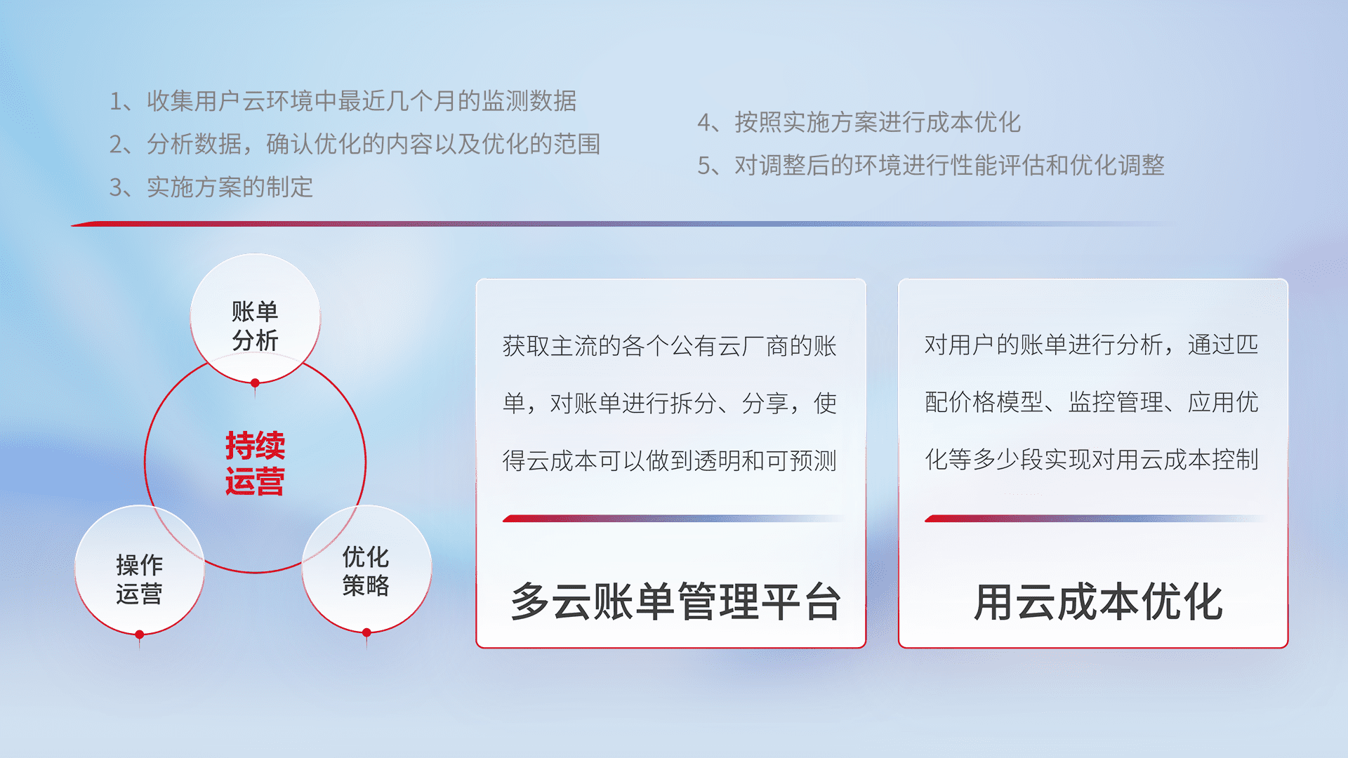 通过多云纳管,,以统一的资源数据模型把客户的云资源进行抽象和封装,,,,进而实现对多云资源的统一操作,,保障云资源管理的可靠性、、、稳定性与可用性。。。。量身定制化运维内容,,,配置、、、、开发运维、、补丁管理、、、、备份、、监控、、、认证和访问管理、、、、审计和日常巡检等,,保障在用云过程中的可靠度,,稳定度以及高可用率。。